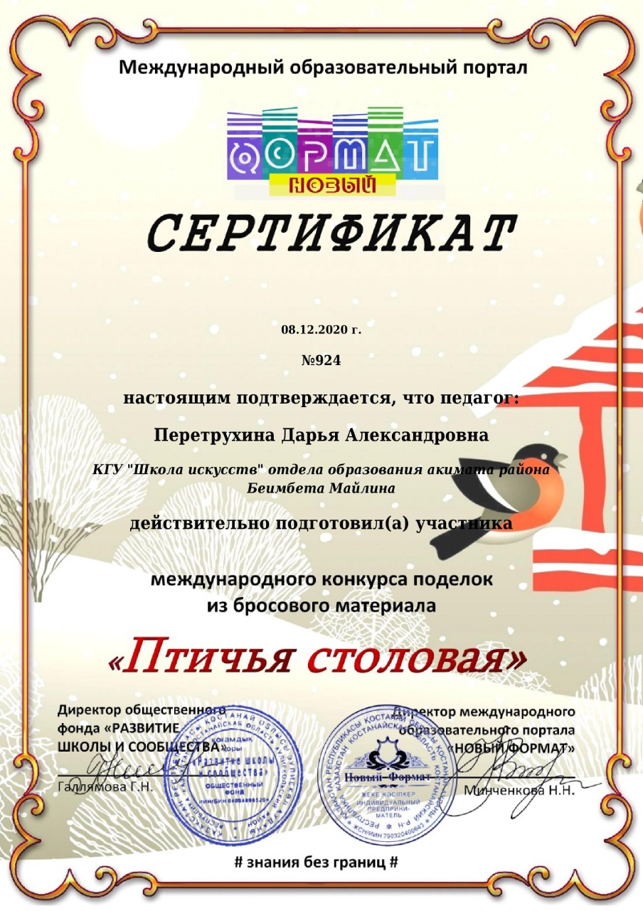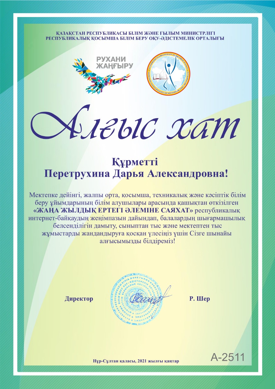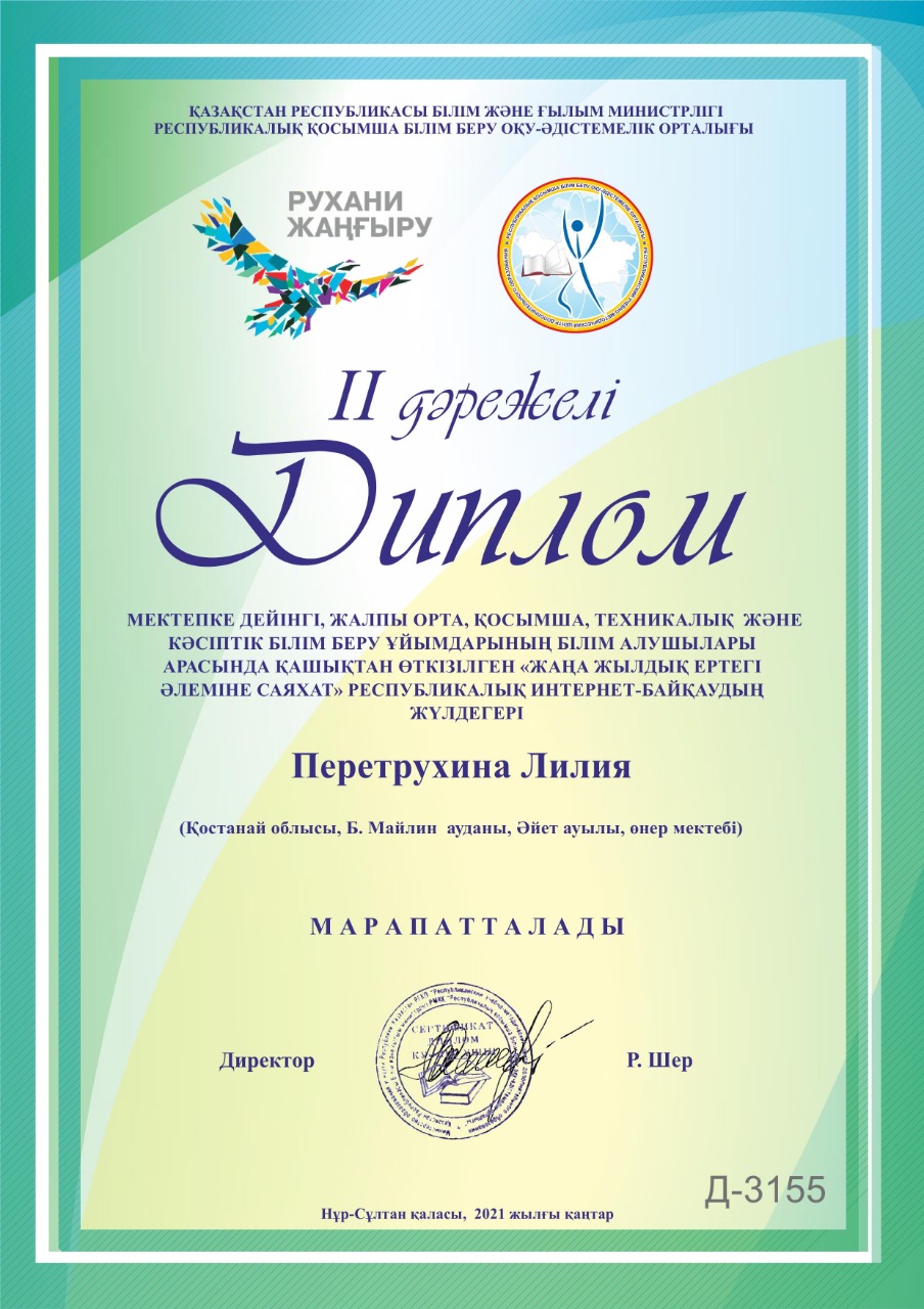 Республиканским учебно-методическим центром дополнительного образования МОН РК с 17ноября 2020 года по 15 января 2021 года на научно-познавательном сайте для детей www.ziyatker.org среди обучающихся организаций дошкольного, общего среднего, дополнительного, технического и профессионального образования проведен Республиканский дистанционный конкурс «Путешествие в новогоднюю сказку». Всего в конкурсе приняли участие 275 обучающихся. Конкурс проводился по следующим номинациям: «Новогодняя сказка», «Креативные идеи для Нового года», «Новогодние чудеса». В номинация «Креативные идеи для Нового года» в младшей возрастной категории: 7-10 лет ученица 0 класса художественного отделения Школы искусств района Беимбета Майлина- Перетрухина Лилия заняла 2 место. Педагог: Перетрухина Д.А. была награждена благодарственным письмом.