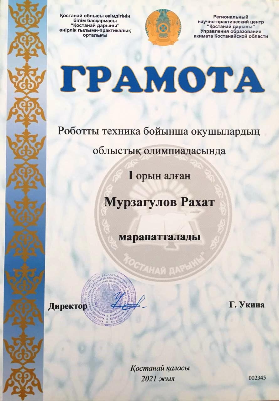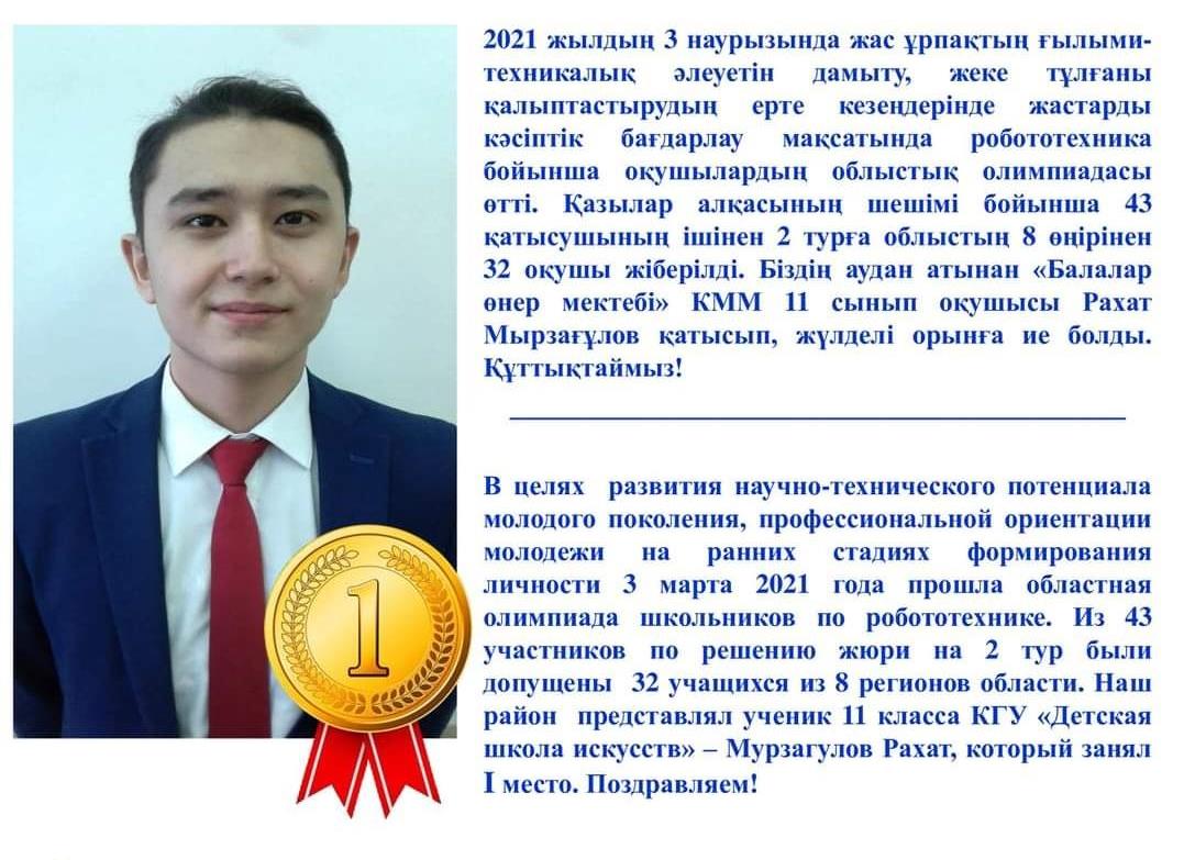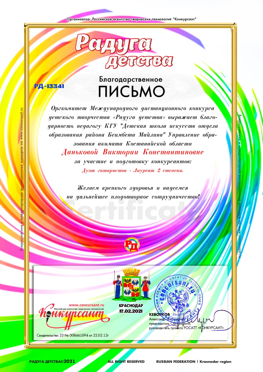 Республиканским учебно-методическим центром дополнительного образования МОН РК с 17ноября 2020 года по 15 января 2021 года на научно-познавательном сайте для детей www.ziyatker.org среди обучающихся организаций дошкольного, общего среднего, дополнительного, технического и профессионального образования проведен Республиканский дистанционный конкурс «Путешествие в новогоднюю сказку». Всего в конкурсе приняли участие 275 обучающихся. Конкурс проводился по следующим номинациям: «Новогодняя сказка», «Креативные идеи для Нового года», «Новогодние чудеса». В номинация «Креативные идеи для Нового года» в младшей возрастной категории: 7-10 лет ученица 0 класса художественного отделения Школы искусств района Беимбета Майлина- Перетрухина Лилия заняла 2 место. Педагог: Перетрухина Д.А. была награждена благодарственным письмом.