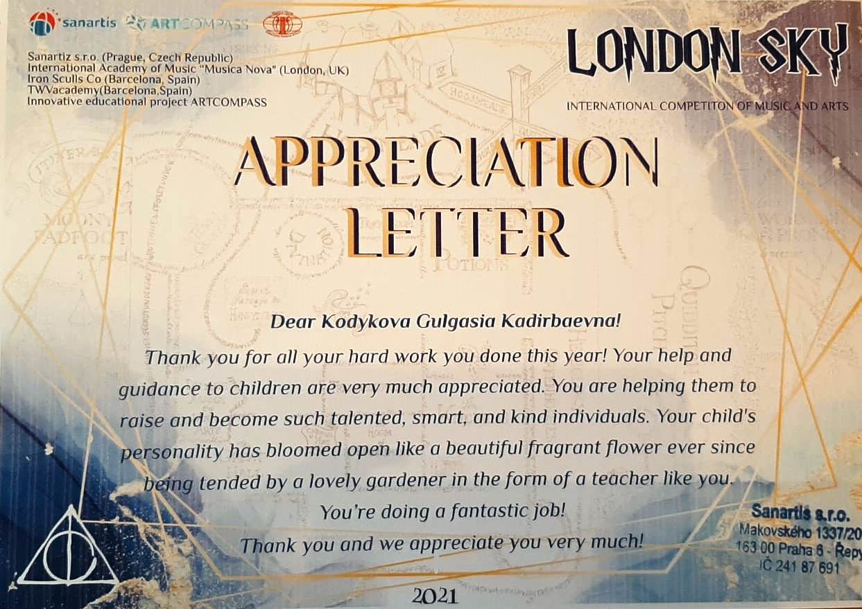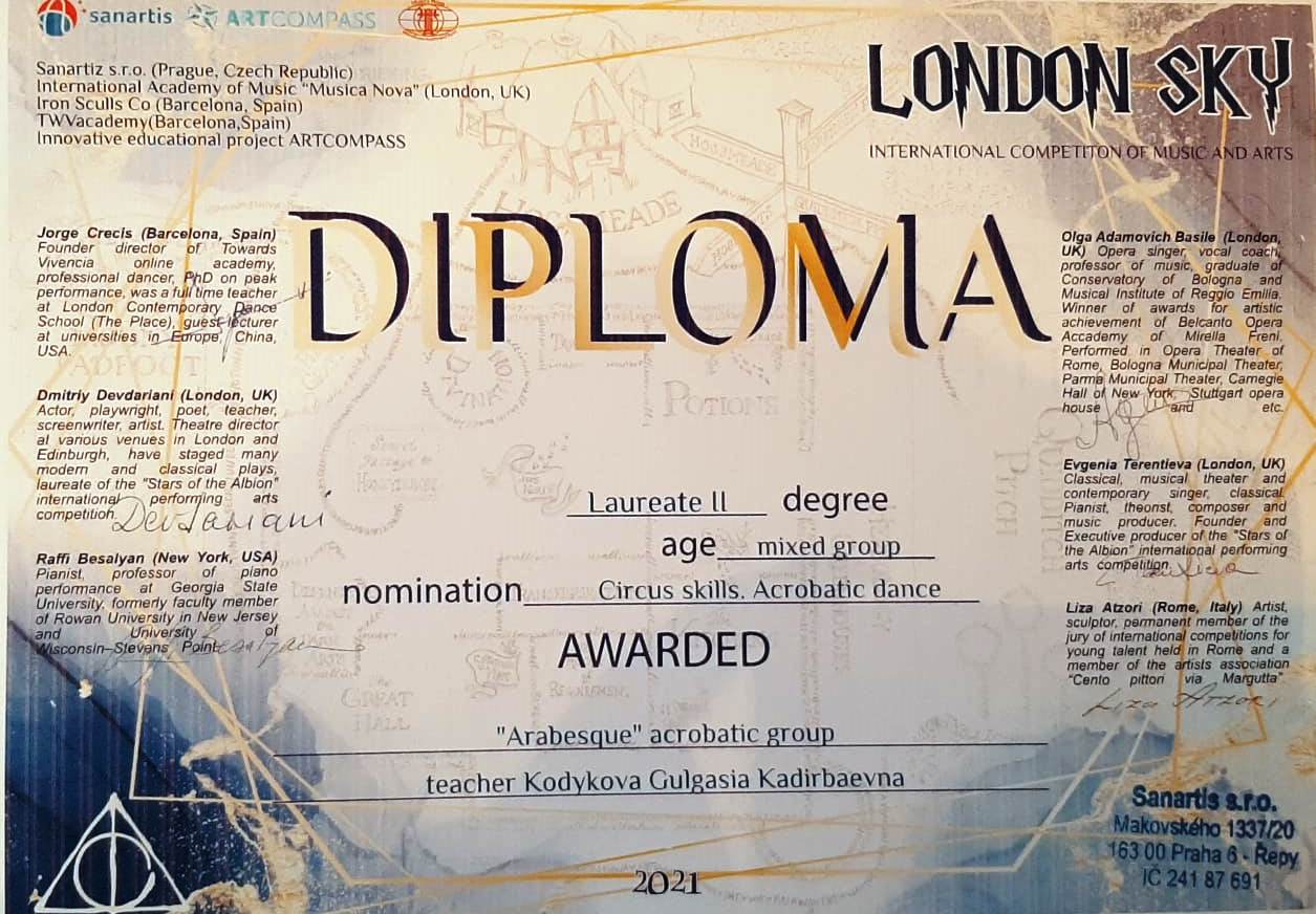 Международная Ассоциация Искусства и Спорта " LUCKY PEOPLE"- является создателем двух крупных культурно- благотворительных творческих проекта Международного значения аналогов которым нет в Казахстане. Проекты Международной Ассоциации Искусства и Спорта "LUCKY PEOPLE" - это прекрасная возможность продемонстрировать свои творческие достижения на конкурсах и фестивалях. С 1 по 15 января 2021 года цирковая группа "Арабеск " КГУ «Детская школа искусств отдела образования района Беимбета Майлина» Управления образования акимата Костанайской области приняла участие в онлайн конкурсе "London Sky" в номинации "Acrobatik danse" и была награждена Дипломом лауреат II степени. Мы желаем детскому коллективу «Арабеск » творческих побед и будем ждать их следующего взлета. Руководитель Кодыкова Гулгасия Кадирбаевна награждена благодарственным письмом . Поздравляем!