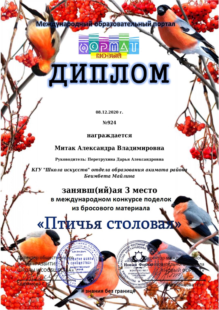 | Выставка. Художественное отделение. 2 четверть 2020 года. Педагог: Перетрухина Д.А. | С 1 по 30 декабря на Международном образовательном портале «Новый формат» проходил конкурс поделок из бросового материала "Птичья столовая". От "Школа искусств" отдела образования акимата района Беимбета Майлина приняли участие 3 ученицы художественного отделения, занявшие 3-е места. 3 место- Митак Александра, ученица подготовительного класса. 3 место- Овчарова Нелли, ученица нулевого класса. 3 место- Цырельчук Анастасия, ученица нулевого класса. |