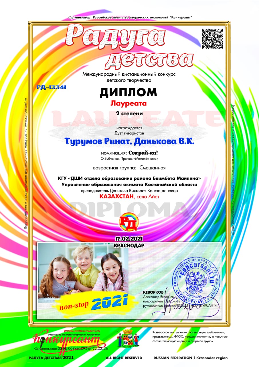 | 17.02.2021 г. проходил международный онлайн конкур детского творчества "Радуга детства". Организаторы конкурса: Оргкомитет международного конкурса г.Краснодар. От "Детской школы искусств района Беимбета Майлина" в номинации: "Сыграй-ка!" принял участие ученик по классу Гитары - Турумов Ринат, где был награждён дипломом II степени. Руководитель Данькова Виктория Константиновна | ![]() |